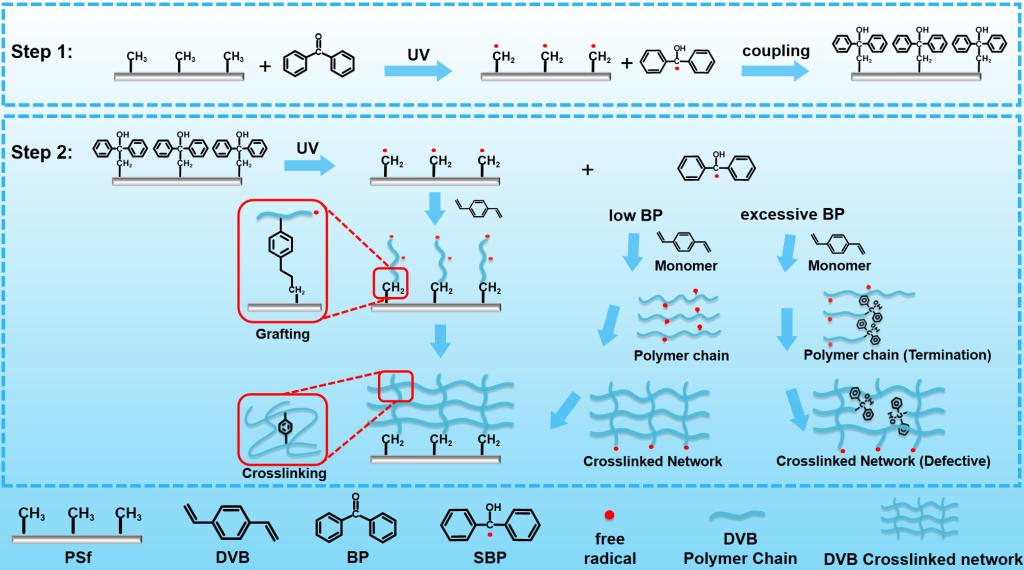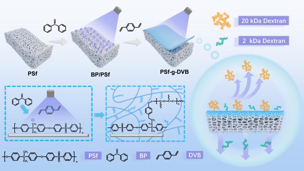 本文以二苯甲酮(BP)为光引发剂,采用紫外光引发的表面接枝聚合方法,在商用聚砜(PSf)膜上接枝二乙烯基苯(DVB),成功制备出具有窄孔径分布的PSf-g-DVB膜。该膜形成致密均匀的三维交联网络,显著提升分子筛分精度,在20/2 kDa右旋糖酐分离中分离系数达11.5,为药用级右旋糖酐的纯化提供了新的技术路径。