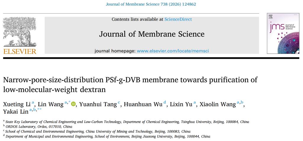 清华大学化工系王晓琳教授/余立新教授/林亚凯副研究员团队于Journal of Membrane Science期刊(2026, 738, 124862)发表题目为Narrow-pore-size-distribution PSf-g-DVB membrane towards purification of low-molecular-weight dextran的文章。该文章第一作者为研究生李雪婷,通讯作者为林亚凯副研究员和汪林助理研究员。