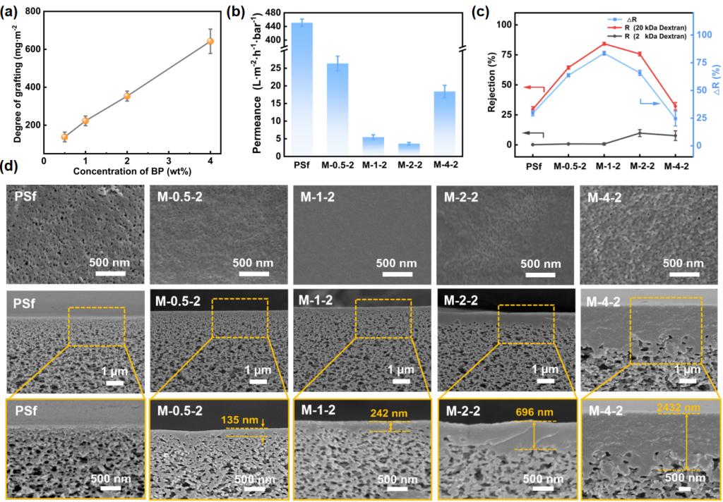 研究发现,光引发剂与交联单体的浓度对膜表面聚合行为及孔结构调控起关键作用。在适宜的BP/DVB配比下(BP含量为1 wt%,DVB含量为2 wt%),紫外光照射诱导PSf基膜表面发生自由基反应,DVB在膜表面进行链增长与交联,形成致密均匀的三维网络结构。该结构显著缩小并均化了膜孔径分布,构筑出窄分布的选择层,从而实现对20/2 kDa右旋糖酐的高精度筛分(△R>80%)。但过高的BP或DVB含量则导致内层接枝或链终止反应增强,使孔结构变粗、选择性下降。